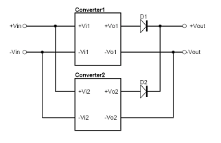 圖3-2為使用Decoupling Diode方式的輸出并聯應用方式,其方式為在二組電源模塊的輸出端,分別串接上二極管,再并聯使用。