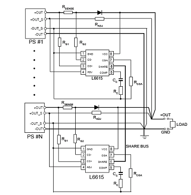 其原理與Drop Resistor相同,使用D1與D2取代電阻的作用,而使用二極管的好處,還可用來防止不同電源模塊之輸出電壓逆流到另一個電源模塊,這在某些電源架構上是需要的。