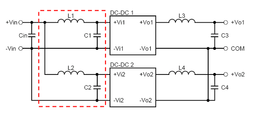 在一電源系統中,若同時使用多組電源模塊,且輸入端使用同一電源時,為防止二組或多組電源模塊之間的交互干擾,形成系統所不樂見的EMI問題,甚至造成系統誤動作的諧波,此時,可在電源系統前端與EMI filter之間加入L1、C1、L2與C2來減低電源模塊之間的交互干擾。