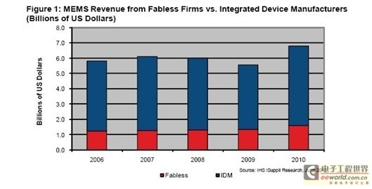 圖所示為2006-2010年IDM與無晶圓制造半導體公司的MEMS營業收入。