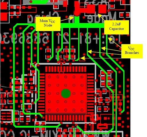 設(shè)計(jì)RF電路時(shí),電源電路的設(shè)計(jì)和電路板布局常常被留到高頻信號(hào)通路的設(shè)計(jì)完成之后。對(duì)于沒(méi)有經(jīng)過(guò)深思熟慮的設(shè)計(jì),電路周圍的電源電壓很容易產(chǎn)生錯(cuò)誤的輸出和噪聲,從而對(duì)RF電路的系統(tǒng)性能產(chǎn)生負(fù)面影響。合理分配PCB的板層、采用星形拓?fù)涞腣CC引線,并在VCC引腳加上適當(dāng)?shù)娜ヱ铍娙荩瑢⒂兄诟纳葡到y(tǒng)的性能,獲得最佳指標(biāo)。合理的PCB層分配便于簡(jiǎn)化后續(xù)的布線處理,對(duì)于一個(gè)四層PCB(WLAN中常用的電路板),在大多數(shù)應(yīng)用中用電路板的頂層放置元器件和RF引線,第二層作為系統(tǒng)地,電源部分放置在第三層,任何信號(hào)線都可以分布在第四層。第二層采用不受干擾的地平面布局對(duì)于建立阻抗受控的RF信號(hào)通路非常必要,還便于獲得盡可能短的地環(huán)路,為第一層和第三層提供高度的電氣隔離,使得兩層之間的耦合最小。當(dāng)然,也可以采用其它板層定義的方式(特別是在電路板具有不同的層數(shù)時(shí)),但上述結(jié)構(gòu)是經(jīng)過(guò)驗(yàn)證的一個(gè)成功范例。大面積的電源層能夠使VCC布線變得輕松,但是,這種結(jié)構(gòu)常常是導(dǎo)致系統(tǒng)性能惡化的導(dǎo)火索,在一個(gè)較大平面上把所有電源引線接在一起將無(wú)法避免引腳之間的噪聲傳輸。反之,如果使用星形拓?fù)鋭t會(huì)減輕不同電源引腳之間的耦合。圖1給出了星形連接的VCC布線方案,該圖取自MAX2826IEEE802.11a/g收發(fā)器的評(píng)估板。圖中建立了一個(gè)主VCC節(jié)點(diǎn),從該點(diǎn)引出不同分支的電源線,為RFIC的電源引腳供電。每個(gè)電源引腳使用獨(dú)立的引線,為引腳之間提供了空間上的隔離,有利于減小它們之間的耦合。另外,每條引線還具有一定的寄生電感,這恰好是我們所希望的,它有助于濾除電源線上的高頻噪聲。