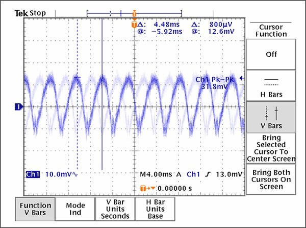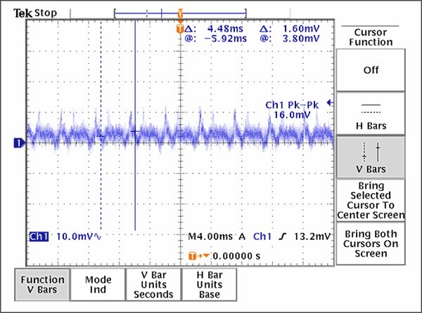 經(jīng)驗(yàn)證明,抑制PLL雜散的有效途徑是合理的接地、電源布局和去耦技術(shù),本文討論的布線原則是減小PLL雜散分量的良好設(shè)計(jì)開(kāi)端。考慮到電荷泵中存在較大的電流變化,采用星形拓?fù)浞浅1匾H绻麤](méi)有足夠的隔離,電流脈沖產(chǎn)生的噪聲會(huì)耦合到VCO電源,對(duì)VCO頻率進(jìn)行調(diào)制,通常稱為“VCO牽引”。通過(guò)電源線間的物理間隔和每個(gè)VCC引腳的去耦電容、合理放置接地過(guò)孔、引入一個(gè)串聯(lián)的鐵氧體元件(作為最后一個(gè)手段)等措施可以提高隔離度。上述措施并不需要全部用在每個(gè)設(shè)計(jì)中,適當(dāng)采用每種方式都會(huì)有效降低雜散幅度。圖9提供了一個(gè)由于不合理的VCO電源去耦方案所產(chǎn)生的結(jié)果,電源紋波表明正是電荷泵的開(kāi)關(guān)效應(yīng)導(dǎo)致電源線上的強(qiáng)干擾。值得慶幸的是,這種強(qiáng)干擾可以通過(guò)增加旁路電容得到有效抑制。圖10顯示的是在電路改變后,在同一點(diǎn)的測(cè)量結(jié)果。