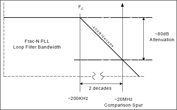 上述討論提出了另外一個(gè)問(wèn)題,即如何有效地將PLL雜散成分限制在一定的范圍內(nèi),使其不對(duì)發(fā)射頻譜產(chǎn)生影響。一旦發(fā)現(xiàn)了雜散成分,首先想到的方案就是將PLL環(huán)路濾波器的帶寬變窄,以便衰減雜散信號(hào)的幅度。這種方法在極少數(shù)的情況下是有效的,但它存在一些潛在問(wèn)題。圖8給出了一種假設(shè)情況,假設(shè)設(shè)計(jì)中采用了一個(gè)具有20MHz相對(duì)頻率的N分頻合成器,如果環(huán)路濾波器是二階的,截止頻率為200kHz,滾降速率通常為40dB/十倍頻程,在20MHz頻點(diǎn)可以獲得80dB的衰減。如果參考雜散成分為-40dBc(假設(shè)可以導(dǎo)致有害的調(diào)制分量的電平),產(chǎn)生雜散的機(jī)制可能超出環(huán)路濾波器的作用范圍(如果它是在濾波器之前產(chǎn)生的,其幅度可能非常大)。壓縮環(huán)路濾波器的帶寬將不會(huì)改善雜散特性,反而提高了PLL鎖相時(shí)間,對(duì)系統(tǒng)產(chǎn)生明顯的負(fù)面影響。