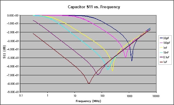 之后,電容的阻抗將呈現(xiàn)出電感性。由此可見(jiàn),電容器只是在頻率接近或低于其SRF時(shí)才具有去耦作用,在這些頻點(diǎn)電容表現(xiàn)為低阻。圖3給出了不同容值下的典型S11參數(shù),從這些曲線可以清楚地看出它們的SRF,還可以看出電容越大,在較低頻率處所提供的去耦性能越好(所呈現(xiàn)的阻抗越低)。