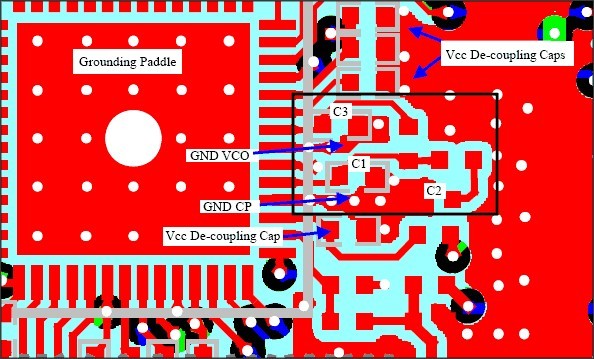 另外,如果電源布線不合理,例如VCO的電源引線恰好位于電荷泵電源的下面,可以在VCO電源上觀察到同樣的噪聲,所產(chǎn)生的雜散信號(hào)足以影響到ACPR特性,即使加強(qiáng)去耦,測(cè)試結(jié)果也不會(huì)得到改善。這種情況下,需要考察一下PCB布線,重新布置VCO的電源引線,將有效改善雜散特性,達(dá)到規(guī)范所要求的指標(biāo)。