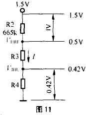 溫度傳感器采用NTC熱敏電阻RT,已知RT在0℃時阻值為333.1kΩ;5℃時阻值為258.3kΩ,則按1.5V工作電壓及流過R1、RT的電流約1.5 uA,可求出R1的值。R1的值確定后,可計算出0℃時的VA值為0.5V(按圖10中R1=665kΩ時),5℃時的VA值為0.42V,則VTHL=0.42V,VTHH=0.5V。若設R2=665kΩ,則按圖11,可求出流過R2、R3、R4電阻的電流I=(1.5V-0.5V)/665kΩ=0.0015mA,按R4×I/=0.42V,可求出R4=280kΩ再按0.5V=(R3+R4)0.0015mA, 則可求出R3=53.3kΩ。