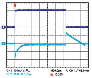 輸出電容還會影響調(diào)節(jié)器對負載電流變化的響應(yīng)??刂骗h(huán)路的大信號帶寬有限,因此輸出電容必須提供快速瞬變所需的大多數(shù)負載電流。當負載電流以500mA/μs的速率從1mA變?yōu)?00mA時,1μF電容無法提供足夠的電流,因而產(chǎn)生大約80mV的負載瞬態(tài),如圖1所示。當電容增加到10μF時,負載瞬態(tài)會降至約70mV,如圖2所示。當輸出電容再次增加并達到20μF時,調(diào)節(jié)器控制環(huán)路可進行跟蹤,主動降低負載瞬態(tài),如圖3所示。這些示例都采用線性調(diào)節(jié)器ADP151,其輸入和輸出電壓分別為5V和3.3V。