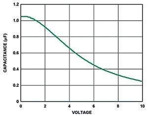 多層陶瓷電容(MLCC)不僅尺寸小,而且將低ESR、低ESL和寬工作溫度范圍特性融于一體,可以說是旁路電容的首選。不過,這類電容也并非完美無缺。根據(jù)電介質(zhì)材料不同,電容值會隨著溫度、直流偏置和交流信號電壓動態(tài)變化。另外,電介質(zhì)材料的壓電特性可將振動或機械沖擊轉(zhuǎn)換為交流噪聲電壓。大多數(shù)情況下,此類噪聲往往以微伏計,但在極端情況下,機械力可以產(chǎn)生毫伏級噪聲。