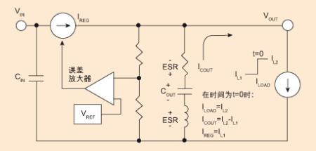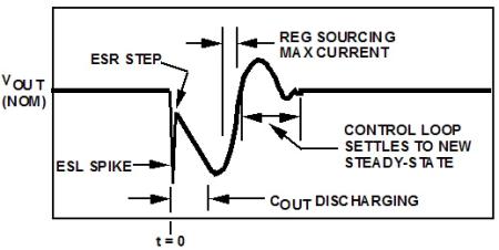 在穩壓器的電流源被控制環路調整到新值之前的時間間隔內,ESR兩側的分壓降低了輸出電壓(這段時間內COUT放電電荷量也會相應有所減少)。