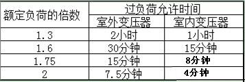過負荷運行是指變壓器運行時超過了銘牌上規定的電流值。過負荷分為正常過負荷和事故過負荷兩種,前者是指在正常供電情況下,用戶用電量增加而引起的,它往往使變壓器溫度升高,促使變壓器絕緣老化,降低使用壽命,所以不允許變壓器過負荷運行。特殊情況下變壓器短時間內的過負荷運行,也不能超過額定負荷的30%(冬季),在夏季不得超過15%。對后者,事故過負荷與允許過的時間要求見下表。