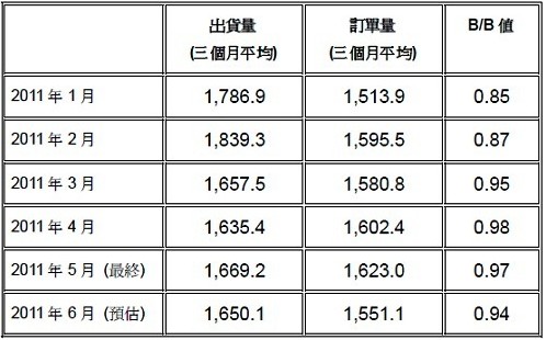 • 2011年6月北美半導體設備B/B值0.94
