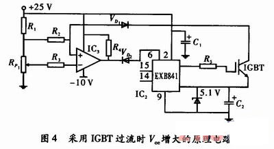當電源輸出過載或者短路時,IGBT的Vce值則變大,根據此原理可以對電路采取保護措施。對此通常使用專用的驅動器EXB841,其內部電路能夠很好地完成降柵以及軟關斷,并具有內部延遲功能,可以消除干擾產生的誤動作。其工作原理如圖4所示,含有IGBT過流信息的Vce不直接發送到EXB841的集電極電壓監視腳6,而是經快速恢復二極管VD1,通過比較器IC1輸出接到EXB841的腳6,從而消除正向壓降隨電流不同而異的情況,采用閾值比較器,提高電流檢測的準確性。假如發生了過流,驅動器:EXB841的低速切斷電路會緩慢關斷IGBT,從而避免集電極電流尖峰脈沖損壞IGBT器件。