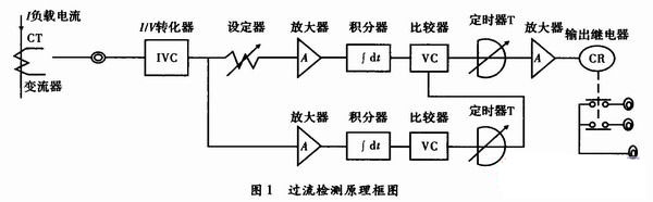 過流檢測傳感器的工作原理如圖1所示。通過變流器所獲得的變流器次級電流經I/V轉換成電壓,該電壓直流化后,由電壓比較器與設定值相比較,若直流電壓大于設定值,則發出辨別信號。但是這種檢測傳感器一般多用于監視感應電源的負載電流,為此需采取如下措施。由于感應電源啟動時,啟動電流為額定值的數倍,與啟動結束時的電流相比大得多,所以在單純監視電流電瓶的情況下,感應電源啟動時應得到必要的輸出信號,必須用定時器設定禁止時間,使感應電源啟動結束前不輸出不必要的信號,定時結束后,轉入預定的監視狀態。