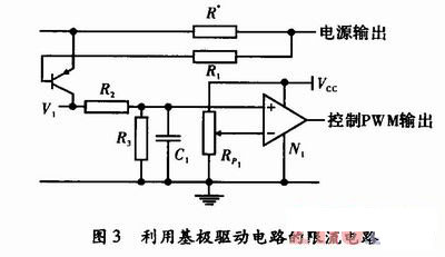 在一般情況下,利用基極驅動電路將電源的控制電路和開關晶體管隔離開。控制電路與輸出電路共地,限流電路可以直接與輸出電路連接,工作原理如圖3所示,當輸出過載或者短路時,V1導通,R3兩端電壓增大,并與比較器反相端的基準電壓比較。控制PWM信號通斷。