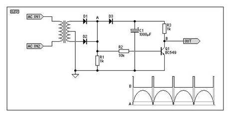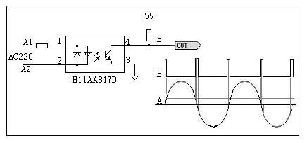 過零點檢測可采用硬件實現(xiàn),在硬件設(shè)計中,可以增加如圖4 或圖5過零點的硬件檢測電路,通過在B端輸出為高電平時進行按鍵狀態(tài)的判斷,以期在電磁輻射最小的時候?qū)τ|摸按鍵進行檢測。