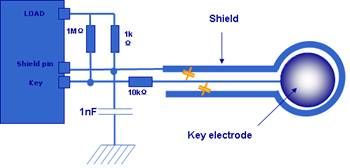在STM8S的解決方案中,ST提供了感應(yīng)電極和走線的設(shè)計規(guī)范和如圖3所示的Driven Shield功能(在Shield線上提供與按鍵管腳相同的驅(qū)動信號,電極與Shield之間的寄生電容就不會被充放電),能有效地減少感應(yīng)電極走線的寄生電容對按鍵靈敏度的影響。