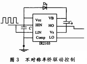 不對(duì)稱半橋驅(qū)動(dòng)電路,如圖3所示。驅(qū)動(dòng)集成芯片采用IR公司的IR2103,其輸出級(jí)作為推挽驅(qū)動(dòng)輸出,以直接耦合的方式與主電路的開關(guān)管相連接,由HO和LO的輸出分別作為驅(qū)動(dòng)橋式電路的上、下橋臂。為了實(shí)現(xiàn)上橋臂驅(qū)動(dòng)電路的地電位與主電路的同步浮動(dòng),采用由DB和CB組成的外接自舉電路。