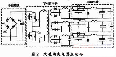 改進(jìn)的新型充電器主電路,如圖2所示。前級(jí)采用軟開關(guān)不對(duì)稱半橋?qū)崿F(xiàn)了多路的隔離輸出,并且利用自身產(chǎn)生的寄生參數(shù),實(shí)現(xiàn)諧振式零電壓軟開關(guān)以此減小開關(guān)的損耗,同時(shí)也避免了因變壓器漏感而帶來(lái)的電壓尖峰。后級(jí)采用成熟簡(jiǎn)單的Buck電路拓?fù)洌瑢?shí)現(xiàn)降壓并用此來(lái)滿足三段式充電的要求。