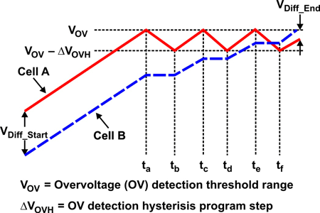 電池平衡算法只使用電壓發散作為平衡標準,具有過平衡(或欠平衡)的缺點,這是由于存在阻抗失衡影響(請參見圖3和圖4)。問題是,電池阻抗還會在充電期間引起電壓差異(VDiff_Start和VDiff_End)。簡單的電壓電池平衡并未區分是電量失衡還是阻抗失衡。因此,這種平衡不能保證完全充電后所有電池均獲得100%的電量。