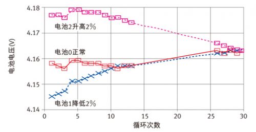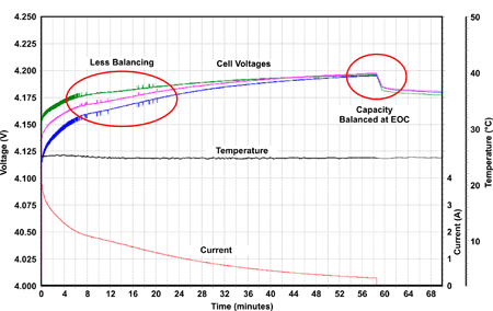 TV抽取就像前面介紹的電壓無源電池平衡。正如圖4所示,充電期間的TV平衡并不總是產生一種趨向放電結束的平衡電量。這是由于我們前面提到過的電池阻抗不匹配。OCV抽取根據電池組電流和電池阻抗測量結果,通過估計OCV來補償阻抗差異。