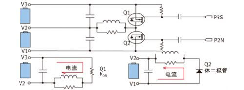 電池組設計人員設定串聯電池之間的失衡閾值。如果IC測量到超出該閾值的失衡,它就會啟用PowerPump。圖8顯示的是使用了兩個MOSFET(Q1和Q2)及一個功率電感的降壓升壓電路簡圖。頂部電池(V3)需要將能量轉移至低位電池(V2),P3S信號(工作在約200kHz和30%占空比下)觸發該能量轉移,隨后能量通過Q1流至電感。當P3S信號重置時,Q1關閉,電感能量水平處在最高水平。因為電感電流必須不斷流動,因此Q2的體二極管被正向偏置,從而完成向V2位置電池的電荷轉移。需要注意的是,由于其串聯電阻較低,存儲于該電感中的能量只有輕微的損耗。