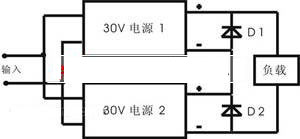 220V交流電壓經(jīng)整流和濾波后得到320V左右的直流電壓,加至電源模塊輸入端。單DC-DC模塊的最高輸出電壓一般為+48V,要得到+60V的直流輸出電壓,必須采用模塊串聯(lián)的方法得到。設(shè)計(jì)采用兩塊PH600S280-28 DC-DC模塊(調(diào)至+30V輸出),通過(guò)串聯(lián)得到+60V的輸出電壓,如圖1所示。