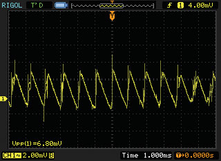測試輸出電壓紋波時,首先由工控機來控制程控電源輸出,其輸出能夠使電源進入正常工作狀態(tài),然后控制程控電子負(fù)載使電源達到100%負(fù)載狀態(tài),再由多通道開關(guān)將DS1302CA示波器接入到電源的輸出端,通過工控機將數(shù)字示波器設(shè)置為直流耦合,使用1:1的探針輸入。另外,為了便于更好地觀察穩(wěn)定的紋波信號,可以打開示波器的“帶寬限制”。最后,將數(shù)字示波器測量出的紋波信號峰峰值上傳至計算機中存儲起來,便得到了該電源的紋波電壓,如圖4所示。
