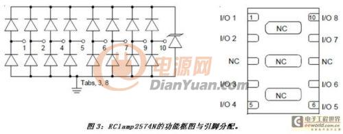 升特公司的最新以太網保護方案RClamp2574N可滿足并超過所有上述要求。建議將其放置于變壓器的PHY端,盡可能靠近磁體。RClamp2574N可配置為保護一個千兆以太網的全部四對差分線對。如圖3所示,八個I/O引腳中的每一個都有一個低電容的控向二極管對,該器件用來將有害的浪涌電流引入內部的低壓TVS二極管。控向二極管的工作電壓僅有2.5V,采用升特公司專利的EPD工藝技術制造。低壓導通是一個很重要的保護參數,因為很多PHY芯片都集成了ESD保護結構。這些結構并非針對承受很大的電能而設計。如果它們在外部保護實