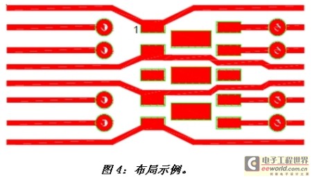 圖4顯示了RClamp2574N的流通型PCB走線。信號線連接到第1、2、4、5、6、7、9和10腳。第3腳與8腳連接到三個中心接地。在一個典型以太網應用中,這些引腳以及接地都應懸空(即不接地)。在本例中,走線寬度為0.005英寸。過孔用于第6、7、9和10腳的換層連接,這樣所有八根信號線都可采用易于實現的流通型(flow though)布局。