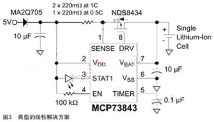 基于Microchip MCP73861的全集成線性解決方案如圖4所示。MCP73861包含了MCP73843的所有功能,另外還包括電流檢測、傳輸晶體管、反向放電保護以及電池溫度監測。
