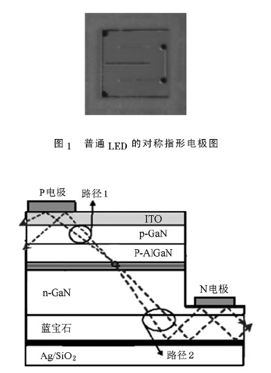 圖2 模擬了光在ODR LED 內部發射時所經過的路徑: 當在p,n 電極上加上正向壓降時,p 區空穴與n 區電子向有源區運動并發生輻射復合,發出的光線有兩條路徑,一條直接射出如圖2 中路徑1,另一條射向襯底下的全方位反射鏡,并發生反射,從頂面或側面射出如圖2 中路徑2,從而增加光射出的路徑,增強LED的光通量與光效.
