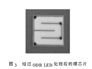 本批實驗樣品采用揚州華夏集成光電有限公司生產的芯片.對一塊外延片整體進行測試,發現測試結果基本一致后試制成芯片. 將該外延片一半制做成普通LED 芯片,另一半制做ODR LED 芯片,芯片的尺寸為40 mil. 選取一個單元中的ODR LED芯片如圖3 所示,與圖2 比較,可以明顯看出芯片亮度不同.