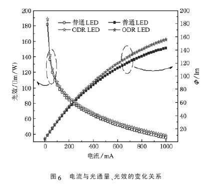 對兩種LED 的光通量和光效隨電流變化進行測量,測量條件與I-V 特性測試相同. 結果如圖6 所示,從圖中明顯看出,兩種LED 的光通量隨著電流升高而逐漸升高,光效均隨著電流的升高而逐漸降低; 而ODR LED 的光通量和光效要始終高于普通LED,這從光通量和光效隨電流變化的角度來證實了ODR LED 的優勢.