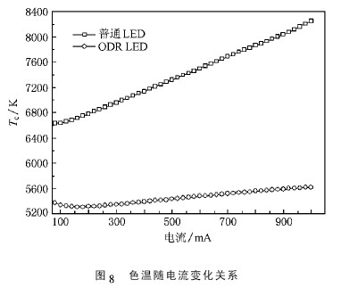 LED 的色溫是把標準黑體加熱溫度升高到一定程度時該黑體顏色開始深紅-淺紅-橙黃- 白-藍逐漸變化,當某光源與黑體顏色相同時,把黑體當時的絕對溫度稱為該光源的色溫. 從圖8 中可以看出,隨著電流的增加,兩種LED 的色溫均呈現增加的趨勢,這是由于電流加大后,兩種LED 的藍光發射強度均增加,而熒光粉的厚度是一定的,則在出射的白光中藍光成份增多,色溫增加. 普 通LED 的色溫偏高,從開始的6632 K 增加至8251 K,色溫始終處于高色溫段,且色溫變化較大; ODR LED 的色溫適中,從5308 K 升高至5619 K,色溫始 終處于中色溫段,且色溫變化幅度要遠小于普通LED 燈,說明ODR LED 在色溫方面有著絕對的優勢---穩定性高.