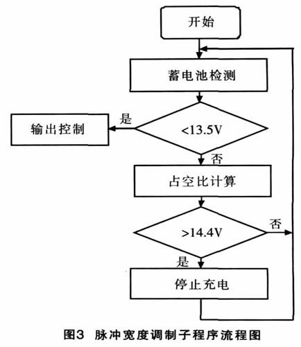 脈寬調制子程序完成太陽電池向蓄電池以脈寬調制的方式充電,控制器根據蓄電池的荷電狀態來控制白天太陽電池向蓄電池充電,其目的是為了改善充電效果和保護蓄電池,防止蓄電池過充。