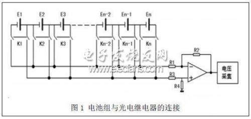 本文作者曾經(jīng)基于光電繼電器隔離法設(shè)計了一套電池管理系統(tǒng),單體電池電壓的測量是采用分時測量的方法。串聯(lián)電池組中各個電池的兩端通過光電繼電器隔離,然后統(tǒng)一連接到檢測總線上。按照一定的時間策略控制光電繼電器的通斷,可控制單體電池在不同的時間段單獨將電壓施加在檢測總線上,從而實現(xiàn)單體電池電壓的分時檢測。該方法的巡檢周期短,測量精度高。但是控制光電繼電器的通斷需要占用大量的I/O 資源,這就限制了電池管理系統(tǒng)可管理電池的數(shù)量。同時在電池管理系統(tǒng)的實際安裝時,由于電池兩端需要引線到采集模塊,所以就會有比較多的走線,導(dǎo)致電池管理系統(tǒng)安裝的不方便及電動車電氣走線的復(fù)雜性。本文為了改善以上的不足,提出一種新的光電繼電器控制策略。光電繼電器與串聯(lián)電池組的連接方式如圖1 所示。