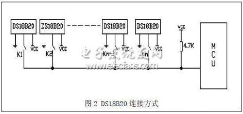 圖中 K1,K2,……Kn 表示的是光電繼電器,其通斷情況同樣由移位寄存陣控制。一開始K1,K2,……Kn 全部閉合,MCU向所有DS18B20 發(fā)送采樣啟動命令,啟動命令發(fā)送完后斷開所有光電繼電器,然后逐個閉合K1,K2,……Kn,讀取相應(yīng)傳感器的溫度數(shù)據(jù),實現(xiàn)分時讀取數(shù)據(jù)。采用同時啟動分時讀取數(shù)據(jù)的多點溫度采樣方法,其所用時間僅比單點溫度采樣所用的時間多了數(shù)據(jù)讀取的時間,所以其采樣速度比較快。
