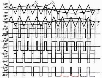 本文采用調(diào)制法產(chǎn)生PWM波形,采用等腰三角波作為載波,因為等腰三角波上任一點的水平寬度和高度成線性關(guān)系且左右對稱,當它與任何一個平緩變化的調(diào)制信號波相交時,如果在交點時刻對電路中開關(guān)器件的通斷進行控制,就可以得到正比于信號波幅值的脈沖,這正好符合PWM控制的要求。