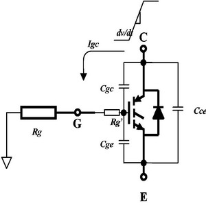 為了理解dV/dt感生開通現象,我們必須考慮跟IGBT結構有關的電容。圖1顯示了三個主要的IGBT寄生電容。集電極到發射極電容C,集電極到柵極電容C和柵極到發射極電容CGE。
