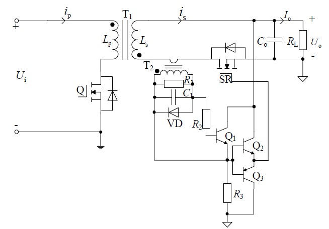 該驅動電路的基本工作原理:電流互感器T2 與次級同步整流管SR 串聯在同一支路,用來檢測SR 的電流。當有電流流過SR 的體二極管,則在電流互感器的二次側感應出電流,該電流通過R1 轉變成電壓,當電壓值達到并超過晶體管Q1 的發射結正向電壓時,Q1 導通,達到二極管VD 導通電壓時,VD 導通對其箝位。晶體管Q1 導通后,輸出電壓通過圖騰柱輸出電路驅動SR 開通。當SR 中的電流在電流互感器二次側電阻R1 上的采樣電壓降低到Q1 的導通閾值以下時,Q1 關斷,SR 關斷。