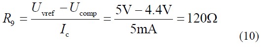 TL431 參考輸入端電壓ref U 為2.5V,電流為1.5μA,為了避免此端電流影響分壓比和避免噪聲的影響,通常取流過電阻R6 的電流為參考輸入端電流的100 倍以上,所以: