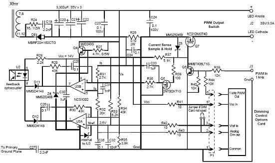 利用這個電路可以實現具有PWM調光輸入和可選調光卡的30 Vout LED驅動器CVCC次級檢測。