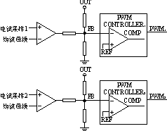 通過檢測RC網絡中C兩端的電壓,作為電流信號,幾路電流信號(本例只有兩路)通過一個相同的電阻就得到了平均值均流母線,平均值均流母線電壓值與負載有關,表征負載電流的大小。然后將每路采樣來的電流信號與母線電壓比較,得到誤差信號,去修正輸出電壓參考信號,從而對PWM控制器的占空比輸出進行微調,達到均流和穩壓的目的。