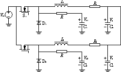 式中:Vc1、Vc2分別為C1和C2上電壓的平均值;IL1、IL2分別是L-和L2流過電流的平均值,亦即兩路輸出電流平均值;R1及R2是濾波電感的等效串聯電阻,當在工藝上設計并聯電源每路輸出電感基本上一樣時,可以認為R1=R2。因此,要控制兩路電流均流,即要求IL1=IL2,于是,只要控制Vc1=Vc2就行了。所以,電容C1及C2上的電壓Vc1和Vc2可以代表兩路電流IL1及IL2大小,可用來進行均流控制。