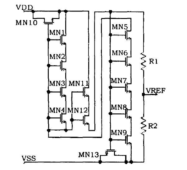 基于耗盡型NMOS管閾值電壓為負值,在VGS=0時也處于工作狀態,該特性可有效降低其工作電壓及功耗。因而,該基準電路中利用串聯的耗盡型NMOS管MN1-MN4、串聯的增強型NMOS管MN5-MN9、MN11-MN12和電阻R1、R2構成基于VGS的基準電壓電路,該基準電路的輸出為檢測比較器反相端的基準電壓信號VREF。