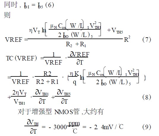 即對于增強型NMOS管,VTH隨溫度升高而下降,而對于耗盡型NMOS管,VTH為負值,其絕對值隨溫度升高而上升。由此推得,當選取合適的參數時,本電路的溫度漂移可以控制在較小范圍內。
