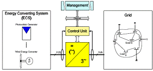 今天,DERs和RESs所使用的逆變器仍然主要采用了被動控制技術(shù)。這意味著對電網(wǎng)接入功率的控制與通過一次能源產(chǎn)生電能的能量轉(zhuǎn)換系統(tǒng)密切相關(guān)。對電網(wǎng)側(cè)來說,它們相當于負的負載。它們將從ECS處獲得的全部功率注入電網(wǎng)。在這種方式下,電網(wǎng)側(cè)的電網(wǎng)控制整合,甚至于主動參與控制和穩(wěn)定電網(wǎng)狀態(tài)變量都是不可能的。