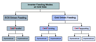 在ECS驅(qū)動饋電時,ECS決定了向電網(wǎng)傳輸?shù)墓β省H缃瘢瑔闻_RESs逆變器典型地就在這種饋電方式下運行,并向電網(wǎng)注入全部可提供的功率。在電網(wǎng)驅(qū)動饋電時,不再是ECS,而是電網(wǎng)決定功率的傳輸。典型的,大多數(shù)常規(guī)大型電廠運行在這種方式下,同樣,這種方式潛在的適合DERs和RESs系統(tǒng),或者至少適合混合式電力系統(tǒng)。在ECS驅(qū)動饋電的情況下,逆變器控制方式被稱作電網(wǎng)平行方式。第二種情況可以被兩種不同的逆變器控制方式實現(xiàn),分別是電網(wǎng)形成方式和電網(wǎng)支持方式。電網(wǎng)形成方式中逆變器的作用是建立和維持電網(wǎng)狀態(tài)變量。電網(wǎng)支持方式中逆變器被用于平衡功率。它可以傳輸預先設定數(shù)量的功率,這個數(shù)量可以根據(jù)電力系統(tǒng)的需要或者高級控制運行得到的參考值進行調(diào)整。應用這個控制方式的逆變器例子如圖3至圖5的左側(cè)所示。此外,這些基本有功功率調(diào)控器潛在的對二次電網(wǎng)控制的相互聯(lián)系可以被類似的闡釋。