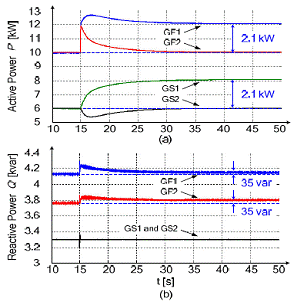 一段時間后,二次控制器控制逆變器動作,第一個電網(wǎng)上的階躍負載只由第一個電網(wǎng)上的逆變器補償。交換功率受到控制重新回到之前的設定值。不同逆變器的無功功率如圖7b所示。開始時,所有逆變器提供的無功功率都近似為14.6kvar。15s的時候,第一個電網(wǎng)的無功功率增加了70var。正如前面提到的,本次仿真并沒有對無功功率進行二次控制。電網(wǎng)形成方式的逆變器補償增加的階躍負載,電網(wǎng)支持方式的逆變器提供相同數(shù)量的無功功率。