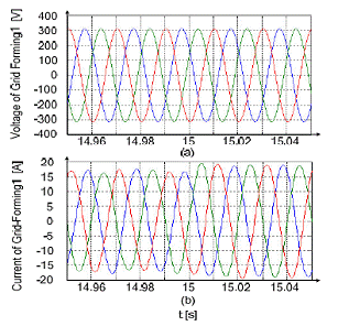 第一個電網(wǎng)形成方式的逆變器在連接點處的電壓和電流如圖9所示。逆變器電壓幾乎不受干擾,與此同時,只有電流去適應相關(guān)負載情況。